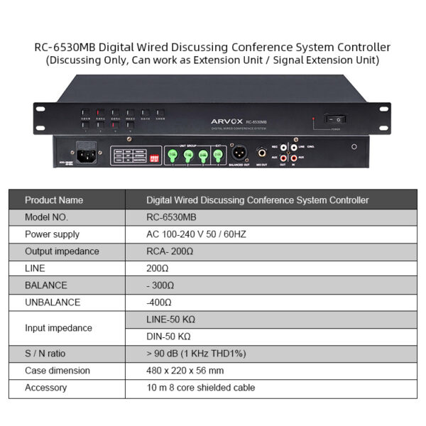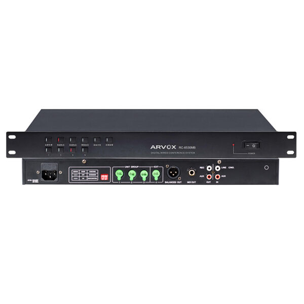 Arvox RC‑6530MB là bộ điều khiển trung tâm (controller) cho hệ thống hội nghị thảo luận (discuss) kỹ thuật số có dây. Thiết bị này đảm nhiệm quản lý toàn bộ âm thanh, quyền nói và cấu hình mô‑hình cuộc họp, giúp điều phối các micro bàn (micro delegate / chairman) một cách chuyên nghiệp.
